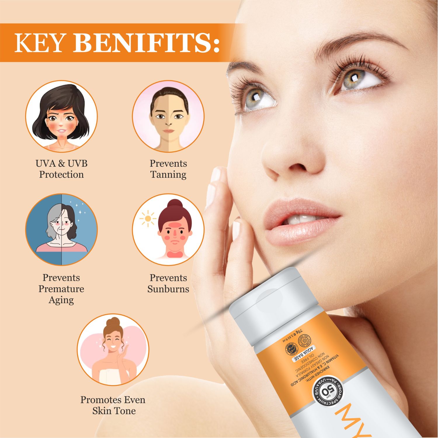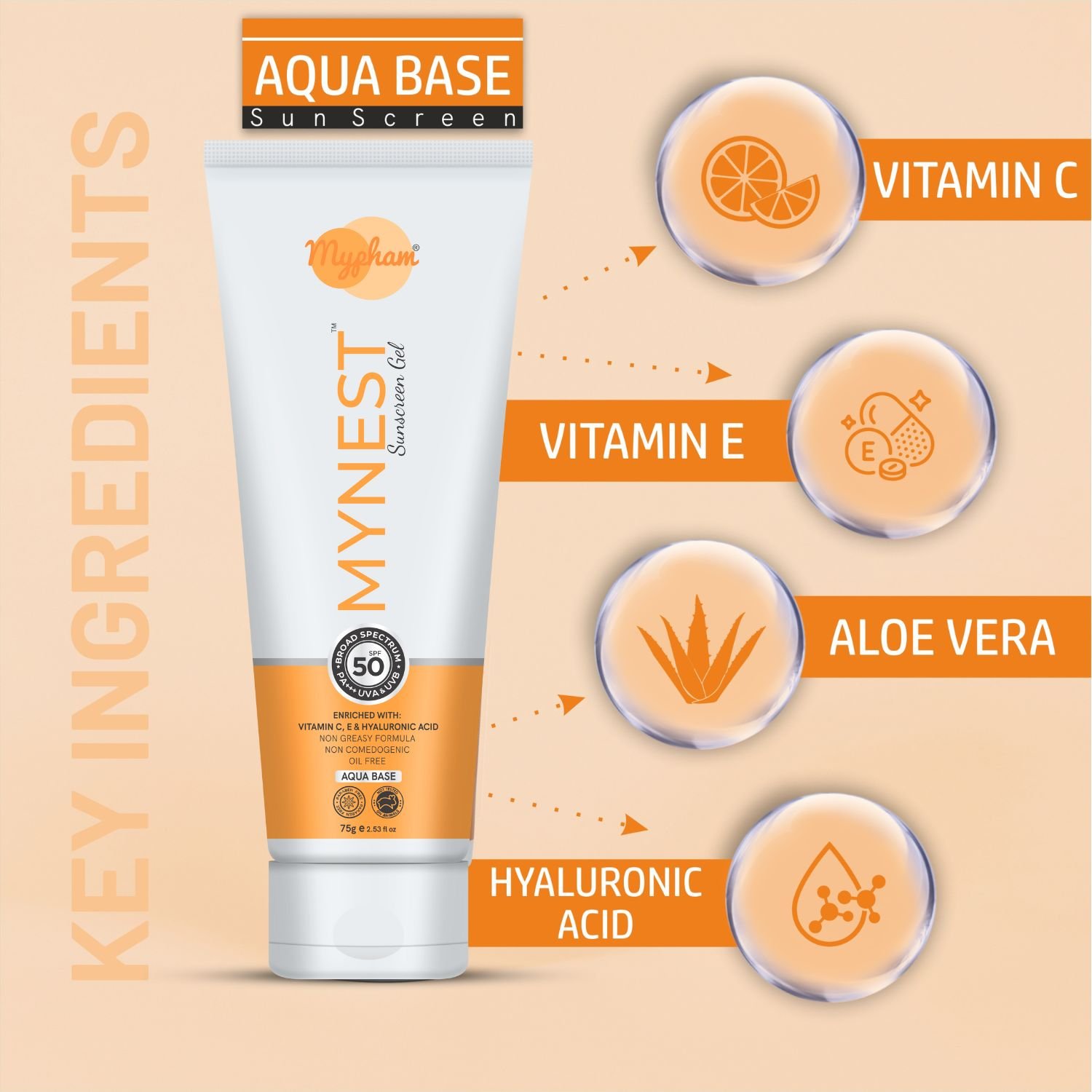 Mypham MYNEST Vitamin C + E SPF 50 Sunscreen Gel, Skin Brightening Sunscreen Lotion Anti Tan, Sun Burn Protection for Men Women
